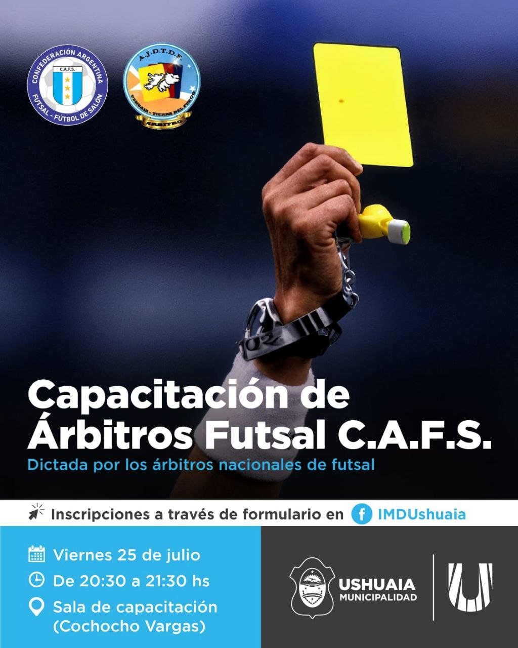 El Instituto Municipal de Deportes (IMD) de Ushuaia abre la inscripción para el Curso de Árbitro de Fútbol C.A.F.S., una capacitación gratuita y con certificación provincial destinada a quienes deseen formarse profesionalmente en arbitraje deportivo. El curso será dictado por la Asociación Civil Jueces Deportivos de Tierra del Fuego, y representa una excelente oportunidad para iniciarse o perfeccionarse en el rol arbitral dentro del fútbol de salón.