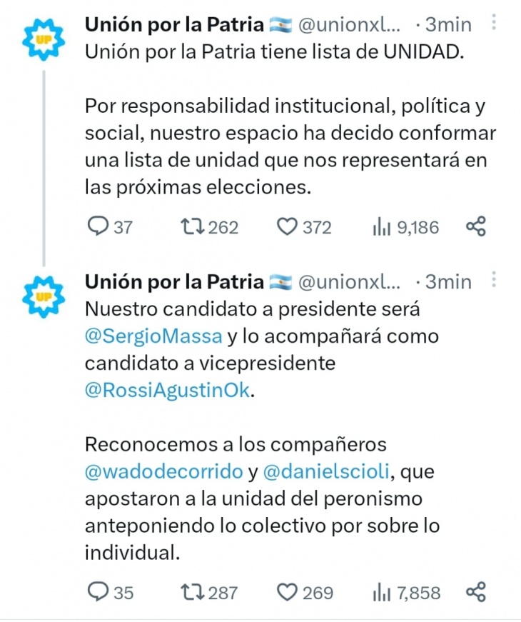 Luego, la vicepresidenta Cristina Kirchner recibió al ministro de Economía, Sergio Massa, en su despacho para ultimar los detalles del anunció. Minutos antes de las 21, la cuenta oficial de Twitter de Unión por la Patria confirmó que Massa sería el candidato a presidente y que estaría acompañado por Agustín Rossi, actual jefe de Gabinete y jefe del bloque de diputados oficialistas durante gran parte de los gobiernos kirchneristas.
